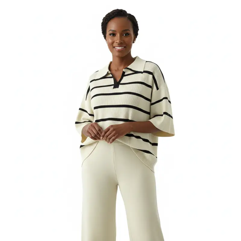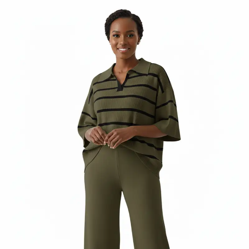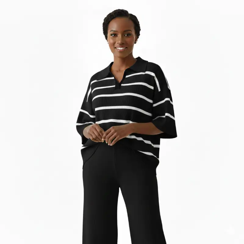 Adoptez un look à la fois chic et décontracté avec l’ensemble Tricot haut et Pantalon pour femmes. Inspiré par l’esthétique, ce duo coordonné marie parfaitement le graphisme classique des rayures marines et la fluidité d’une coupe contemporaine. C’est l’ensemble idéal pour celles qui recherchent une silhouette sophistiquée sans compromis sur le bien-être.