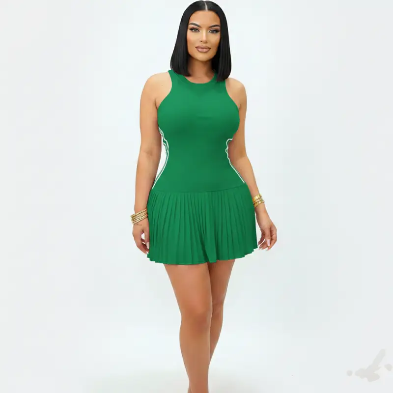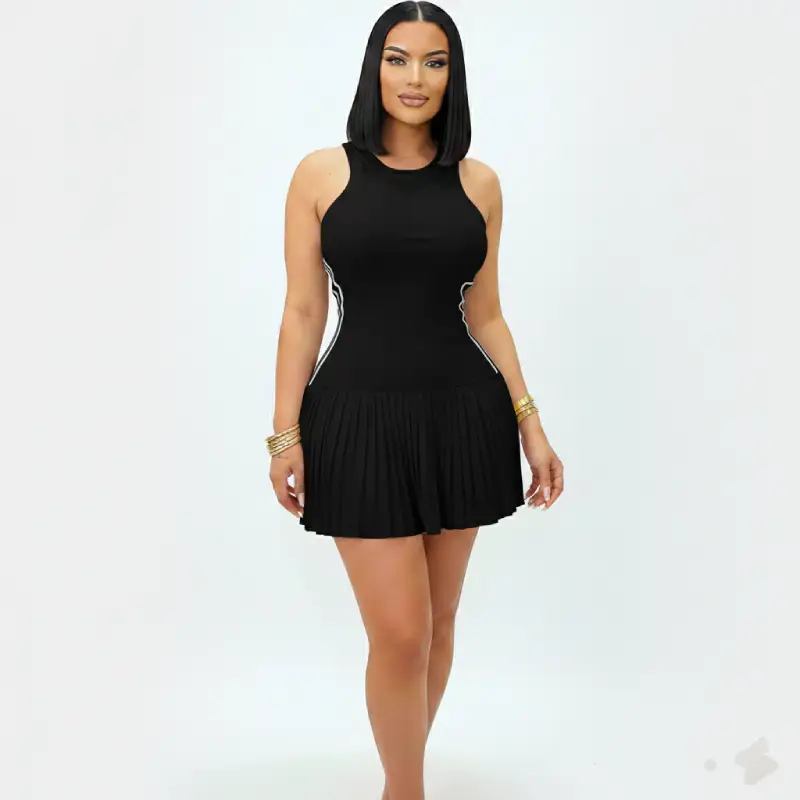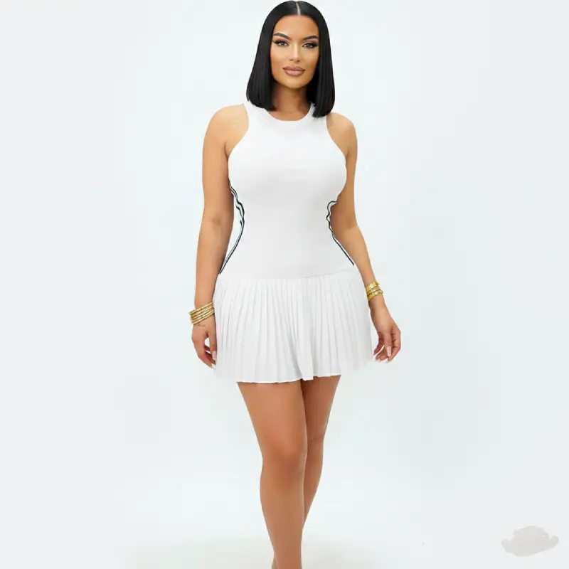 Affirmez votre style avec notre robe courte sans manches, une pièce maîtresse qui fusionne les codes du vêtement de sport haut de gamme et de la mode urbaine sophistiquée. Sa coupe structurée et ses détails contrastés en font le choix idéal pour celles qui recherchent une allure dynamique sans compromis sur le glamour.