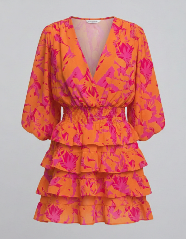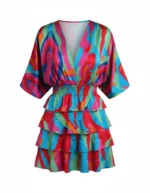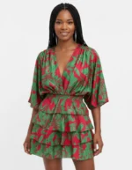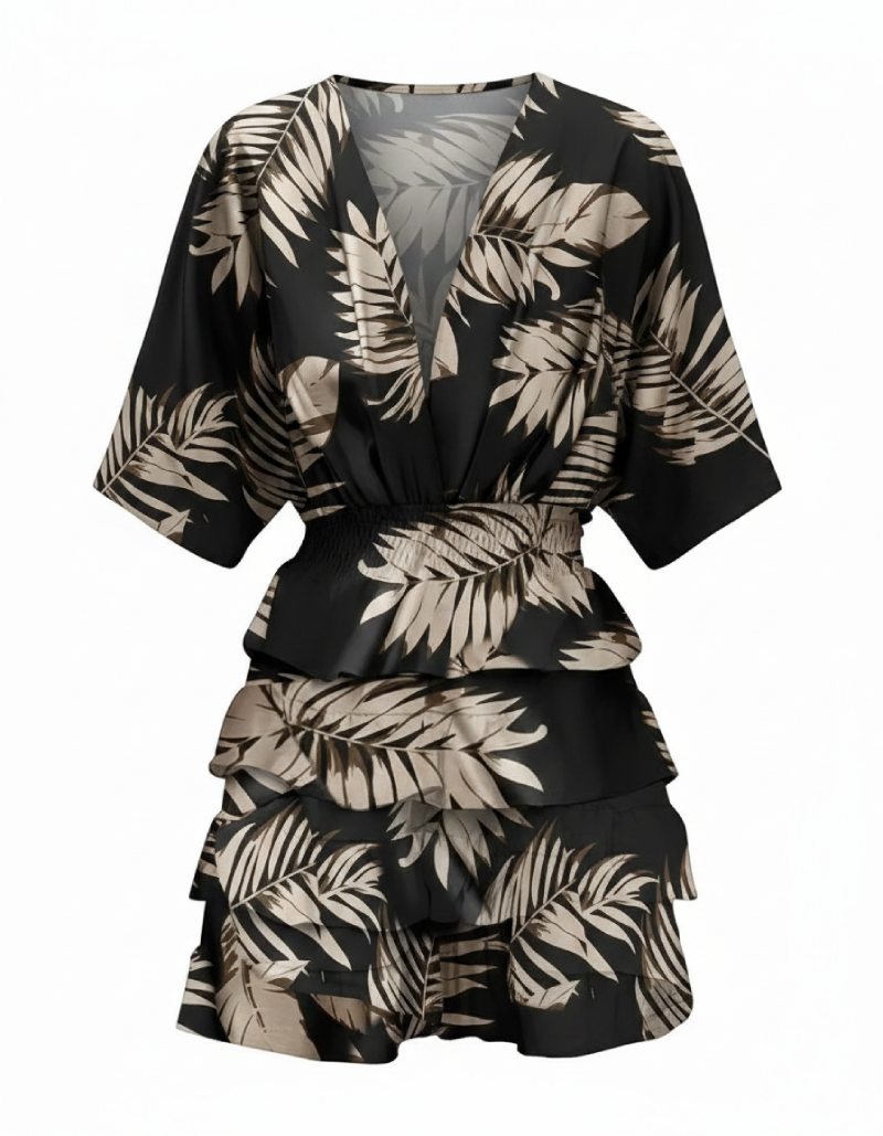 Apportez une touche d’élégance exotique à votre garde-robe avec cette magnifique robe courte. Son imprimé feuillage beige sur fond noir offre un contraste sophistiqué, parfait pour passer d’une journée ensoleillée à une soirée estivale.