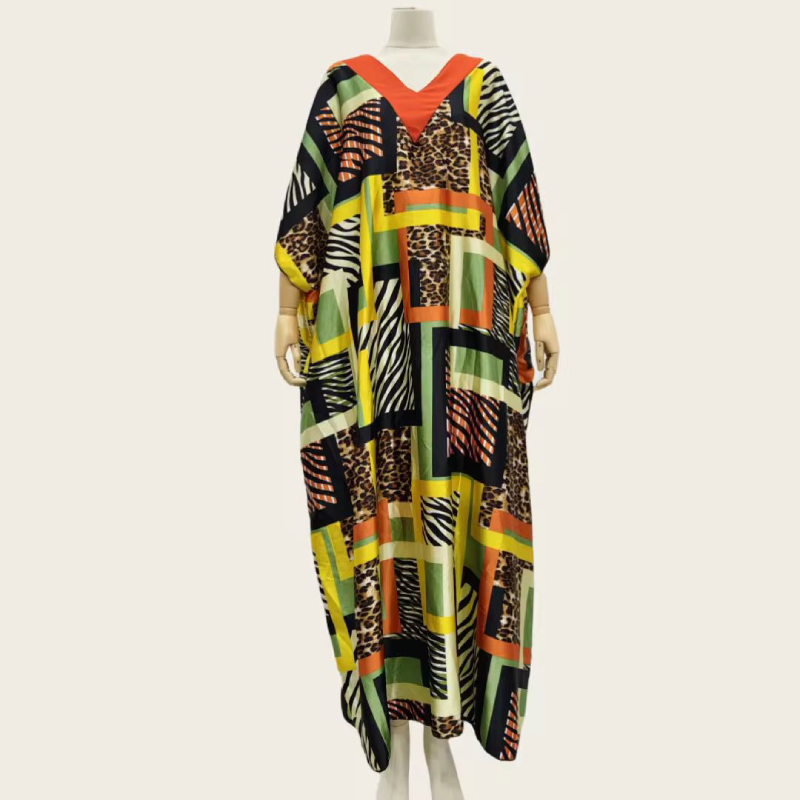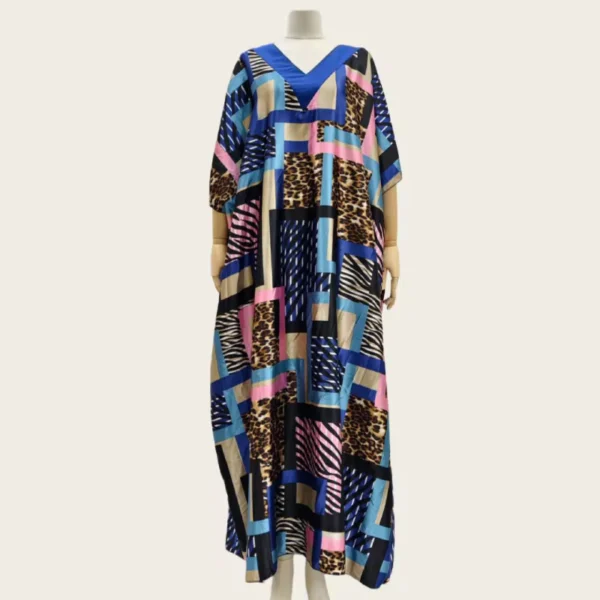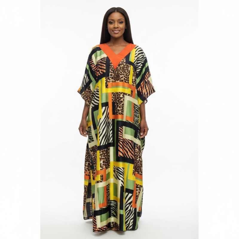 Sublimez votre silhouette avec cette robe kaftan longue, une pièce maîtresse qui allie audace et élégance. Conçue pour la femme moderne qui n’a pas peur de s’affirmer, elle mélange avec brio des motifs animaliers intemporels (léopard et zèbre) et des blocs de couleurs géométriques vibrants.