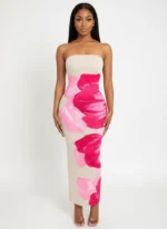 Sublimez votre silhouette avec la robe Éclat Floral, une pièce maîtresse conçue pour les femmes qui osent l’audace et le raffinement. Cette robe longue bustier se distingue par son fond beige crème apaisant, contrasté par des motifs floraux artistiques dans des tons de fuchsia vibrant et de rose poudré.