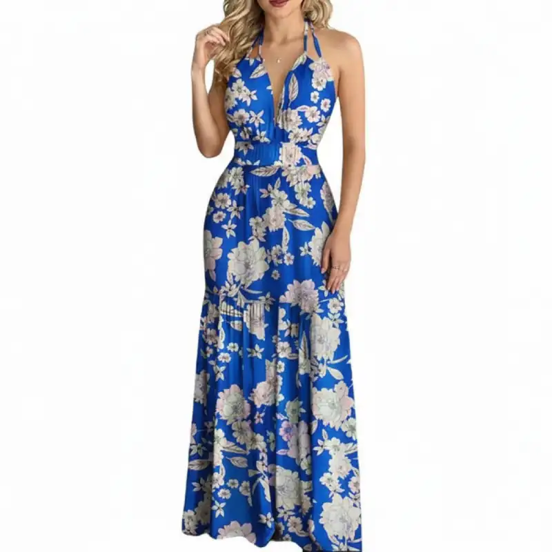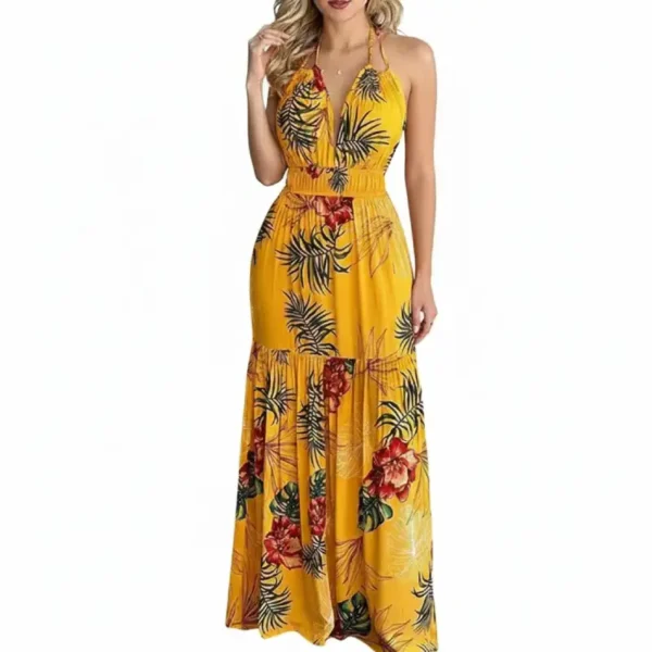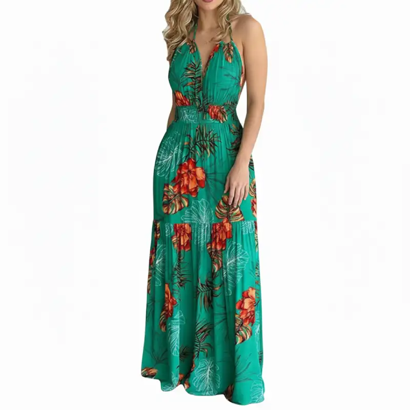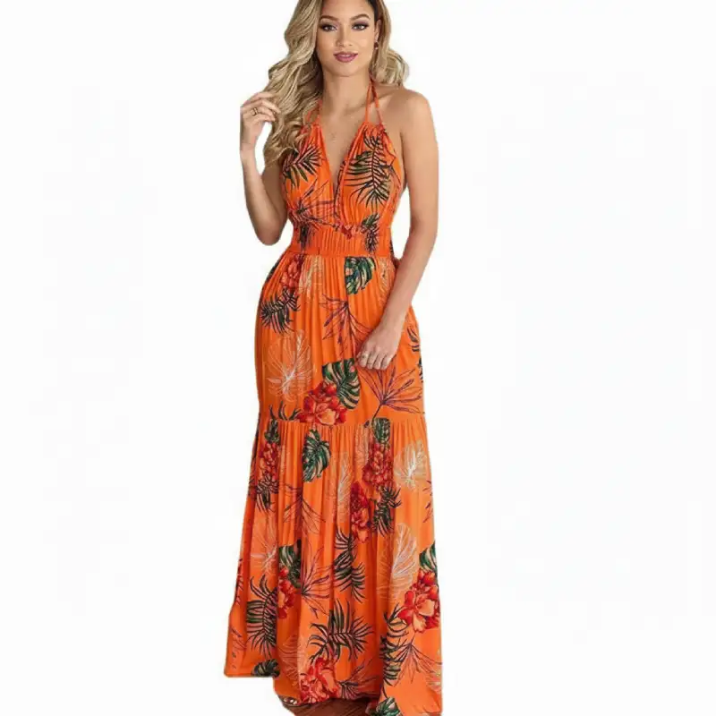 Laissez-vous séduire par la robe maxi Seng, une pièce magistrale qui célèbre la féminité avec audace et légèreté. Dominée par un orange vibrant et chaleureux, elle est ornée d’un imprimé floral et tropical luxuriant, mêlant des nuances de vert émeraude et de rouge floral pour un look résolument exotique.