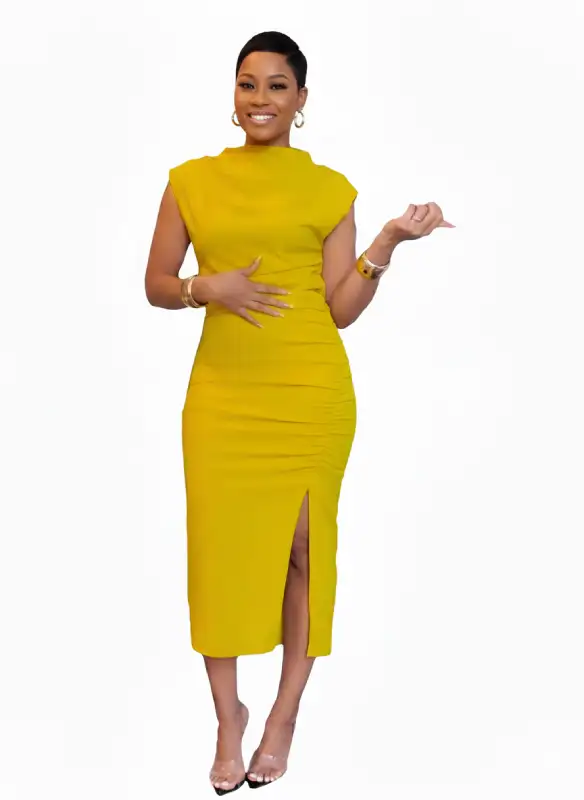 Son jeu de fronces latérales crée un effet drapé sophistiqué qui souligne la taille tout en offrant un confort absolu. Le col montant apporte une touche de distinction “couture”, tandis que la fente audacieuse sur la jambe vient dynamiser l’allure. C’est la robe idéale pour celles qui souhaitent une présence remarquée, que ce soit pour un événement professionnel, un cocktail ou une cérémonie.