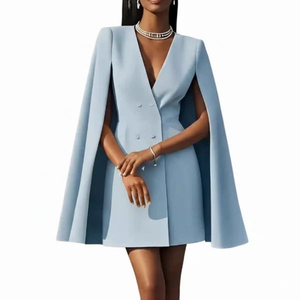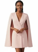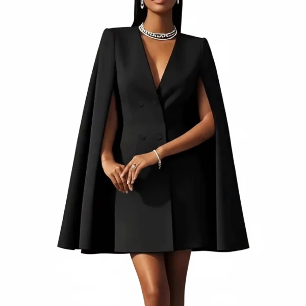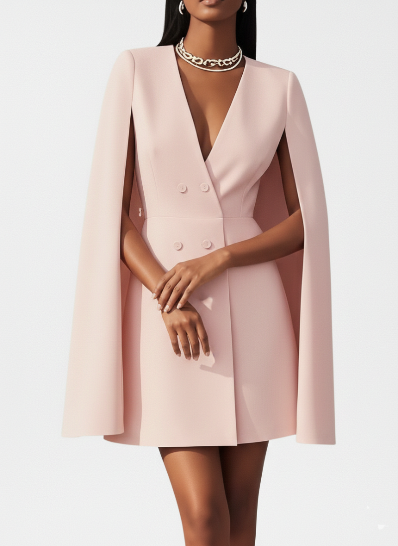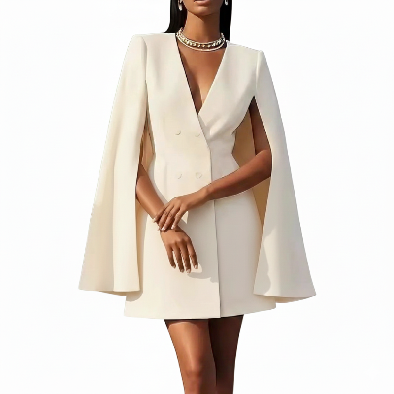 Affirmez votre allure avec cette pièce maîtresse de notre collection. Mi-robe de cocktail, mi-blazer structuré, ce modèle se distingue par sa coupe cape iconique qui apporte une dimension majestueuse à votre silhouette.
