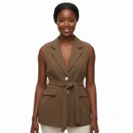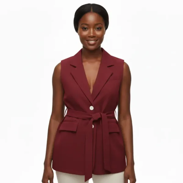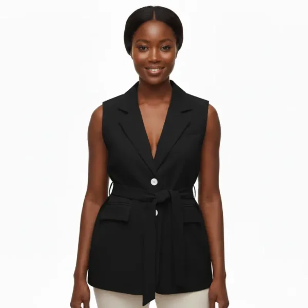 Cette pièce est un gilet de costume long sans manches (souvent appelé “veste sans manches” ou “blazer sans manches”), d’une couleur jaune moutarde éclatante. C’est un vêtement à la fois structuré et moderne, idéal pour un look “working girl” ou chic décontract